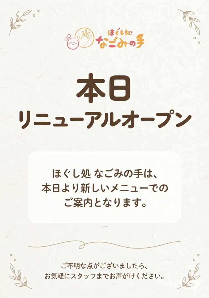 そんな想いを形にしたのが、このたび新しく生まれ変わった 「ほぐし処 なごみの手」 です。