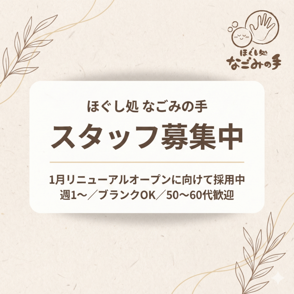 ほぐし処 なごみの手(旧もみほぐし処 もみたん 糀谷店)では、リニューアルオープンに向けてセラピストを増員募集しています。 経験者・未経験問わず、50〜60代の方も大歓迎。「落ち着いた地域のお店で、長く働きたい」そんな方にぴったりの職場です。 ■ ... -